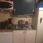 Kuchnia ma urządzenie do parzenia kawy/herbaty oraz kuchenkę mikrofalową, lodówkę i szklane naczynia.